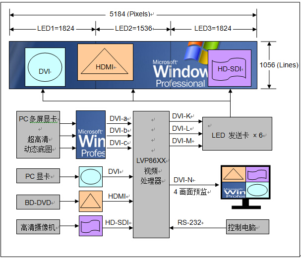 LED大屏點對點顯示超高清動態底圖,該超高清信號來自PC多屏卡的3路DVI輸出