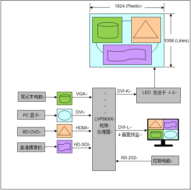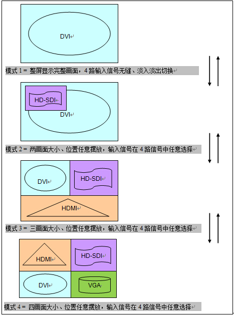 LED大屏顯示1---4任意窗口畫面,每個窗口大小、位置任意調整,窗口疊加次序任意設置