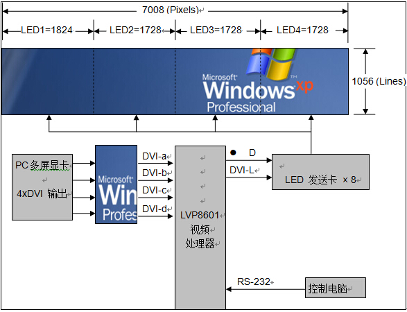 LED大屏點(diǎn)對點(diǎn)顯示超高清畫面,該超高清信號來自PC多屏卡的4路DVI輸出