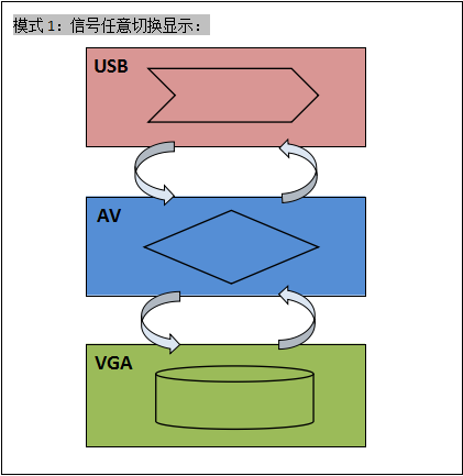 三組信號間(Video、VGA、DVI/USB)無縫切換或淡入淡出切換;